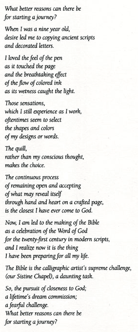 The techniques are traditional, but the intention is modern-and forward-looking. "We expect this Bible to last for centuries and centuries and to stand as a testimony to what people at our point in history thought about scripture and religious art," said St. John's president, Brother Dietrich Reinhart, on Tuesday at the Northern Trust Bank, which planned to introduce clients to Jackson later in the day. "All of this stuff, the ink, the pen, the surface-we're not using it just because it's traditional," Jackson said. "We're using it just like a violinist uses something ot far distant from a cigar box with a piece of wood in it and catgut strung across it."